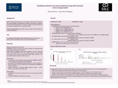 Background: People living with dementia are more likely to move into care homes. The true prevalence of dementia among care home residents in Scotland is not known. People living with dementia often interact with multiple social and healthcare services, thus routine data may offer a way to enhance understanding. Aim: To compare national health and social care data sources recording dementia status for Scottish care home residents. Methods: A retrospective cohort study of adult (≥ 18 years) care home residents in Scotland during financial years 2012/13 and 2013/14. An indexing process linked