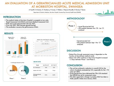 Introduction The medical intake at Morriston Hospital is accepted on two units; Rapid Assessment Unit (RAU) and Acute Medical Assessment Unit. Both were acute physician-led until July 2021 (Phase 1). From July 2021, RAU became geriatrician-led (Phase 2). This evaluation concerns the performance of RAU. Phase 1 (Acute Physician-Led Unit) Between 01/08/2020-30/06/2021, there were 3102 admissions with a median length of stay (LOS) of 2 days on RAU. 37.2% of patients were discharged directly from the unit. (SBUHB data). A detailed analysis of 496 patients consecutively assessed between November