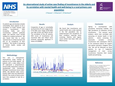Background: The prevalence of urinary incontinence and frailty increases with ageing. As an adaptive mechanism patients become socially isolated resulting in worsening of mental health anxiety and depression. Aims/Objectives: We undertook a retrospective observational study of frail patients with an eFI above 0.33 to look for a correlation between eFI, GAD and phQ-9 scores. Methods: The records of 600 patients with an eFI above 0.33 ( n=600 ) were analysed for declared symptoms of incontinence using the Michigan Incontinence Score Index (MISI) to see if there was a correlation with mental