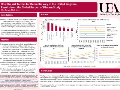 Introduction: Dementia is one of the leading contributors of disability in the UK. Evidence of a downward trend in age-adjusted incidence of Dementia has highlighted the potential impact of modifiable risk-factors in reducing the disease burden of Dementia. This research will determine how risk-factors of Dementia have varied over time, between the different countries of the UK, the different regions of England and by sex in the UK. Methods: This is a descriptive time-series of risk factors of Dementia within the United Kingdom (UK) between 1990 and 2019. Data was extracted from the Global