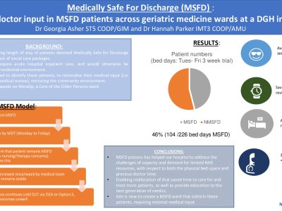 Introduction: Large numbers of geriatric inpatients within acute settings are deemed medically safe for discharge (MSFD) but stranded within the hospital due to a lack of community services and social care packages, leading to increasing length of patient stay and reduced hospital flow. These patients do not require inpatient care and would otherwise be discharged to their home or residential care. This project aimed to identify these patients and rationalise their medical input to mirror a community setting (without routine daily medical reviews). Methods: MSFD patient were identified by the