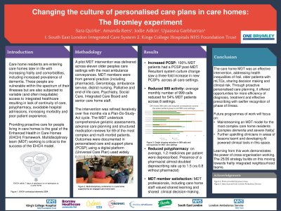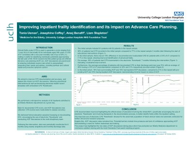 Introduction: The British Geriatric Society has been a forerunner in describing the potential benefits of a comprehensive geriatric assessment and advance care planning for all patients and focusing on wellbeing strategies for this vulnerable patient group. QIP project was undertaken with the aim to look at the fast track discharges and advance care planning documentation in accordance with the EOL care strategy 2008. Through reviews of individual cases, it is thought that advance care plans (with recognition and interventions for patients thought to be in their last year of life) would