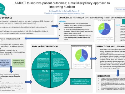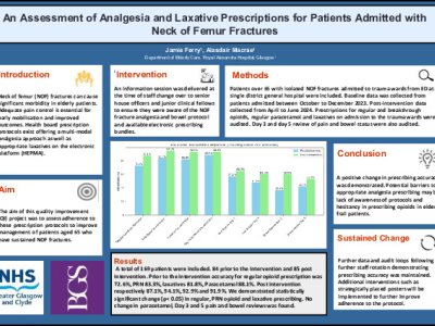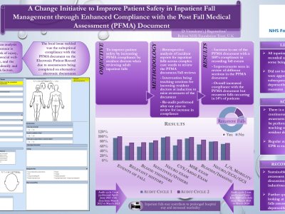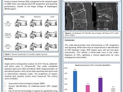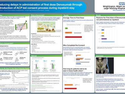 Improving bone health assessment in a geriatrics centre: Natalie Maria Jones IMT3 Introduction: The National Osteoporosis Guideline Group (NOGG) quotes that one in five men and one in two women will experience a fragility fracture in their lifetime. The cost of fragility fractures to the NHS in 2019, exceeded £4 billion (1). An important and often overlooked aspect of falls assessment is that of osteoporosis detection and treatment. This project aimed to improve % of patients receiving a bone health assessment within a tertiary geriatric unit to 100% by September 2025. Method: The project took
