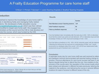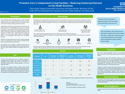 Abstract title : Clinical Leadership in Pathways using Care Providers: Improving Flow, Experience, and Efficiency for Frail Older Adults Introduction: Frail older adults are often discharged from hospital with complex needs into community care services. Without senior clinical oversight, many experience fragmented care, delayed reviews, inappropriate care planning, and avoidable readmissions. This project evaluated the impact of introducing clinical leadership into a care provider pathway designed to deliver short-term, post-discharge domiciliary care. Methods: Over 11 weeks, 51 patients were