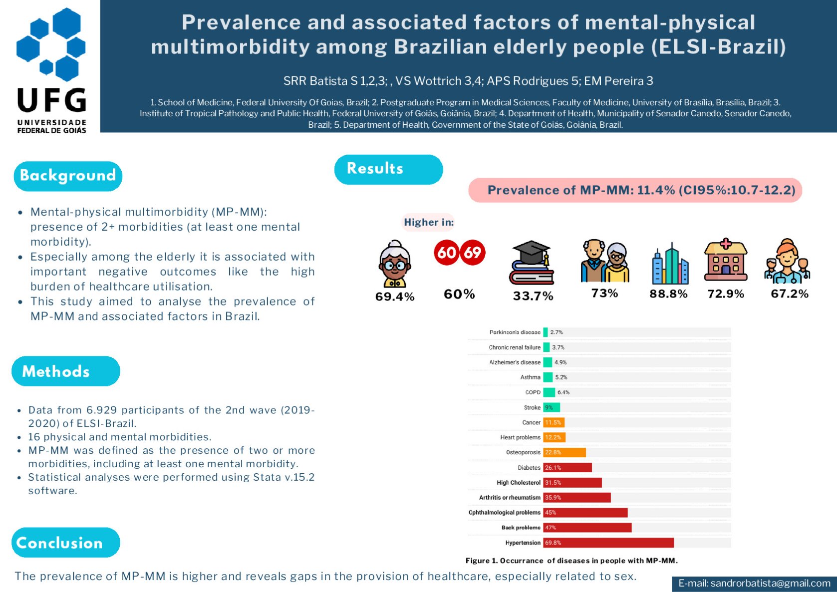 Mental-physical multimorbidity (MP-MM) is defined by the presence of two or more morbidities, including at least one mental morbidity. Especially among the elderly it is associated with important negative outcomes like the high burden of healthcare utilisation. This study aimed to analyse the prevalence of MP-MM and associated factors among 6.929 participants of the second wave (2019-2020) of the Brazilian Longitudinal Study of Ageing (ELSI-Brazil). MP-MM was defined as the presence of two or more morbidities, including at least one mental morbidity, and was evaluated using a list of 16 physical and mental morbidities. Frequency description of variables and bivariate association were performed using Stata v.15.2 software. The prevalence of MP-MM was 11.4% (CI95%:10.7-12.2), higher in women (69.4%), individuals between 60-69 years (60.0%), high scholarship (33.7%), with a partner (73%), living in an urban area (88.8%), without health insurance (72.9%), and in an area with primary care coverage (67.2%). A higher prevalence of hypertension (69.8%) was higher in MP-MM individuals. The prevalence of MP-MM is higher and reveals gaps in the provision of healthcare, especially related to sex.