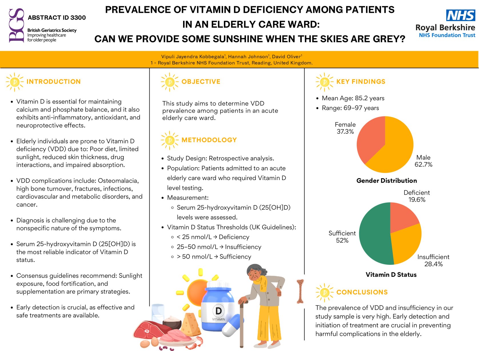 Vitamin D is essential for blood calcium and phosphate homeostasis. In addition, it has anti-inflammatory, anti-oxidant and neuroprotective effects. The geriatric population is vulnerable to Vitamin D deficiency (VD) due to poor dietary intake, reduced exposure to sunlight, reduced skin thickness, drug interactions, and impaired absorption and metabolism. VD is associated with osteomalacia, high bone turnover, an increased risk of hip fractures, infection, cardiovascular and metabolic disorders and cancer risk. Clinical diagnosis of VD is difficult due to vague symptoms. It is recommended to check serum 25-hydroxyvitamin D (25[OH]D) as it indicates the best Vitamin D status in the body with both skin-synthesised and dietary sources. According to “ Vitamin D in the older population-consensus statement”, the primary treatment strategies are exposure to sunlight, food fortification and supplementation. Early detection of VD is crucial because effective and safe treatment options are available. This study aims to determine VD prevalence among patients in an acute elderly care ward.