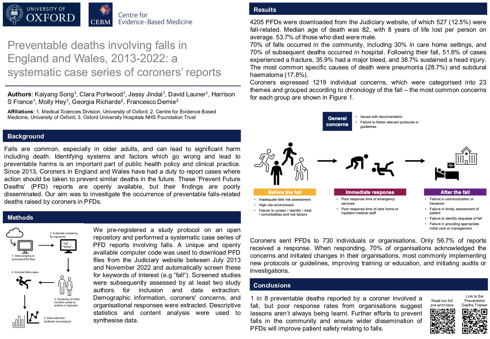 Falls in older people are common and can lead to significant harm including death. Coroners in England and Wales have a duty to report cases where action should be taken by organisations to prevent deaths, but dissemination of the findings from these Prevent Future Deaths (PFD) reports remains poor, limiting their possibility to effect change. We set out to identify preventable fall-related deaths, classify coroners’ concerns, and explore organisational responses to these deaths.