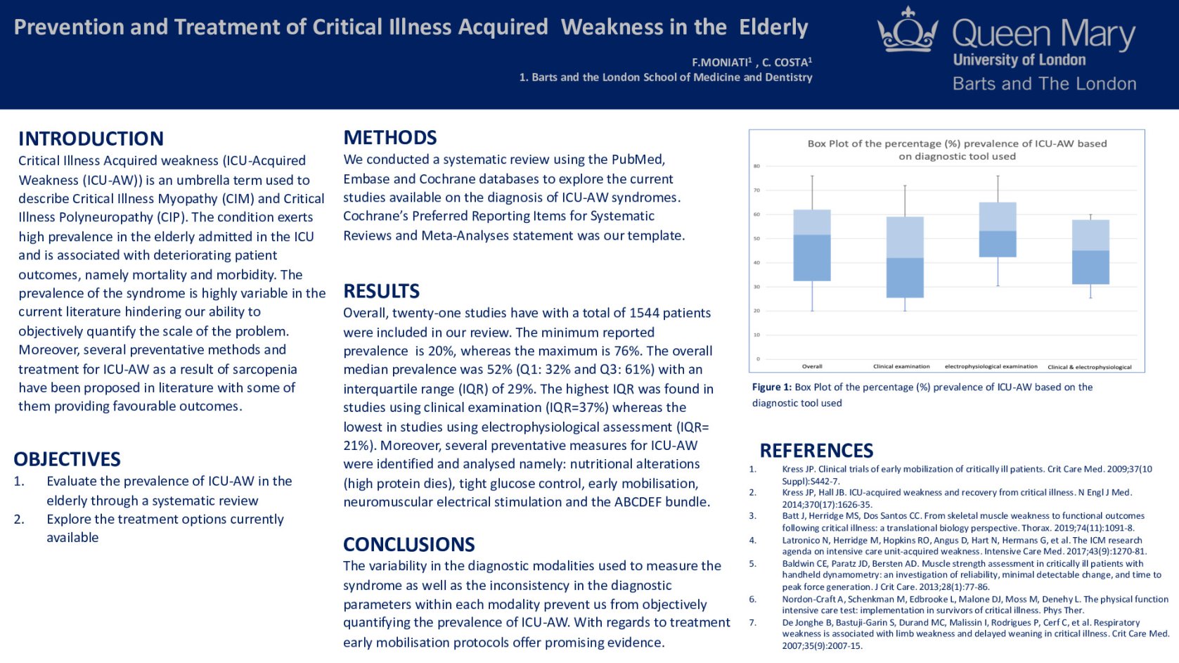 Results Overall, twenty-one studies (1544 patients) were included. The minimum reported prevalence is 20%, whereas the maximum is 76%. The overall median prevalence was 52% (Q1: 32% and Q3: 61%) with an interquartile range (IQR) of 29%. The highest IQR was found in studies using clinical examination (IQR=37%) whereas the lowest in studies using electrophysiological assessment (IQR= 21%). Moreover, several preventative measures for ICU-AW were identified and analyzed namely: nutritional alterations (high protein dies), glucose control, early mobilization, neuromuscular electrical stimulation and the ABCDEF bundle.