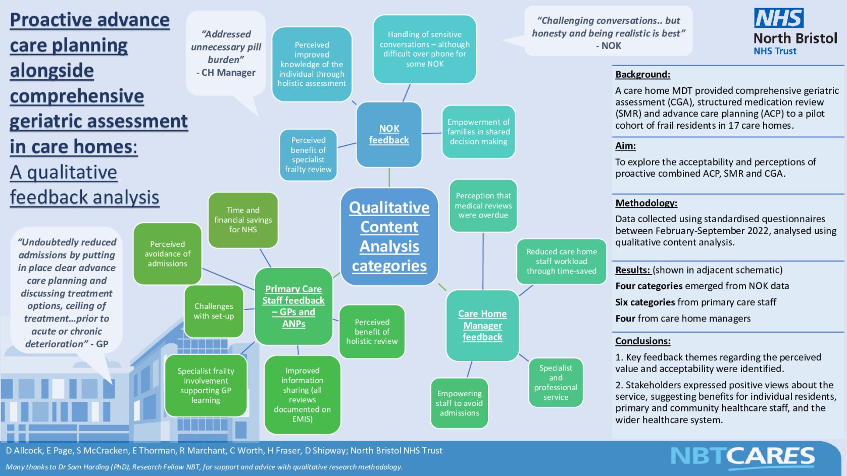 This evaluation identified key feedback themes in relation to the perceived value and acceptability of a dedicated care home team performing CGA based ACP. Stakeholders expressed positive views about the service, suggesting benefits for individual residents, primary and community healthcare staff, and the wider healthcare system.