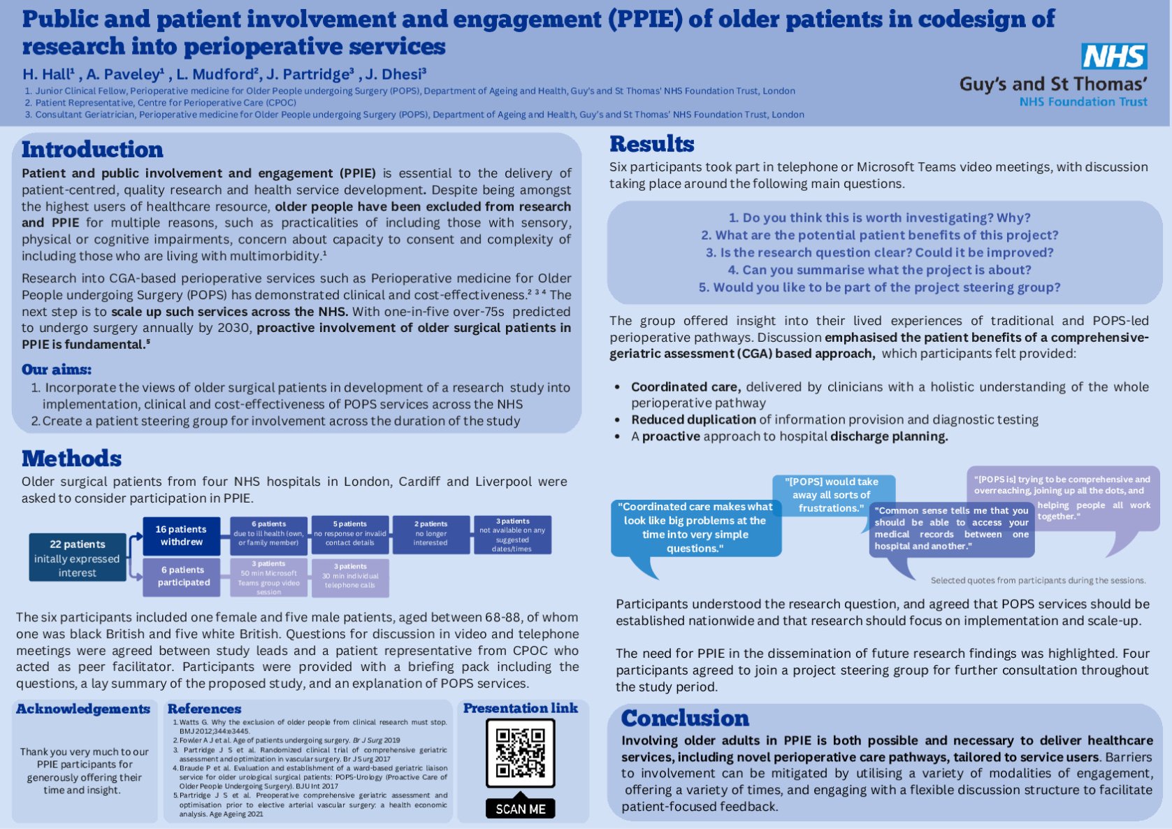 Patient and public involvement and engagement (PPIE) is essential to delivering patient centred, quality research. Older adults constitute an increasing proportion of the surgical population but are unintentionally excluded from traditional models of engagement.