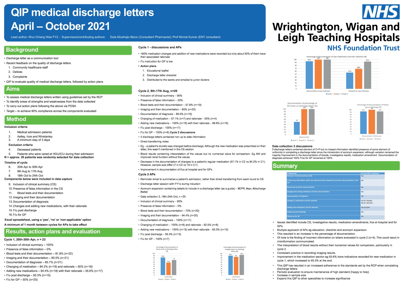 This project has resulted in an increase in adherence to the standards set by the College when completing medical discharge letters. Periodic evaluation will be beneficial to ensure that a high standard of compliance is consistently achieved. Sample size could be increased to improve the significance of evaluation. This study can be expanded to other specialties to increase coverage.