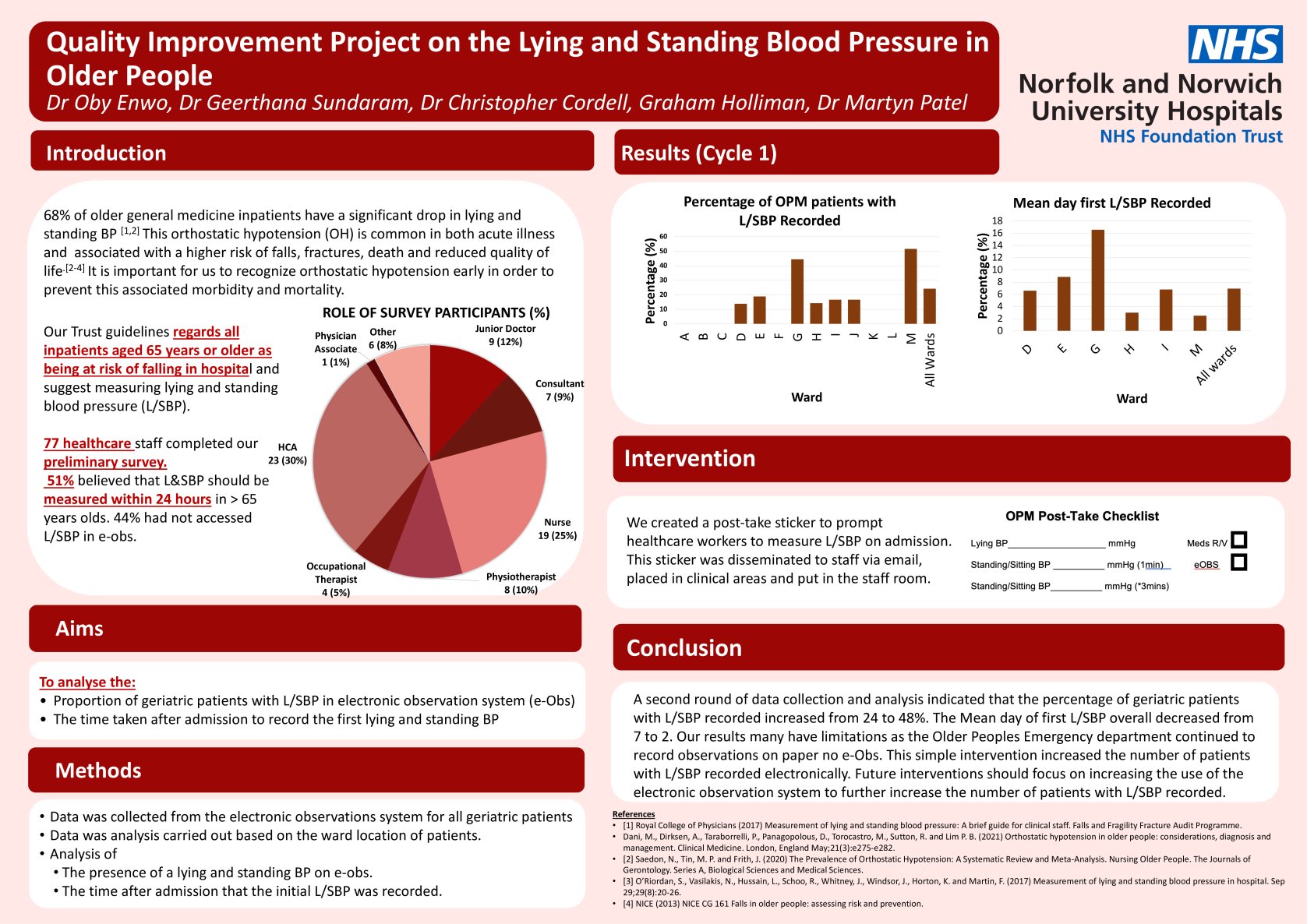 This Quality Improvement Project aimed to improve rates of LSBP measurement on all geriatric inpatients during their current admission. To carry this out we extracted data from the electronic observation system (e-Obs), calculated the proportion of patients with LSBP recorded and date of first recording during their current admission.