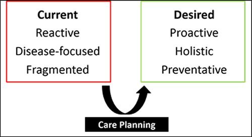 It is important to emphasise that care planning is much more than solely preparing for when a patient’s condition deteriorates. A more pro-active, positivist outlook on care planning is to consider care plans as a way of empowering patients to maintain or improve their health - central to this process is goal setting. Traditionally, goal setting has tended to remain within the medical paradigm; that is the goals themselves have tended to focus on treatments, medications or test results. Effective care plans, that improve health and well-being, require goals that are based on patients' personal targets and should link to functional outcomes that they want to achieve.