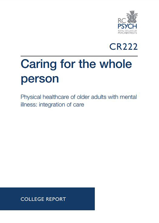 This Report, produced by the Royal College of Psychiatrists' Faculty of Old Age Psychiatry and endorsed by the BGS, highlights the multiple physical health needs of older adults with mental illness, particularly those in psychiatric in-patient wards. The report covers the most commonly encountered co-morbid conditions and it provides both practical advice for front line staff as well as making recommendations on training and commissioning of services to help achieve better outcomes for older people. It emphasises the value of an integrated collaborative approach to care.