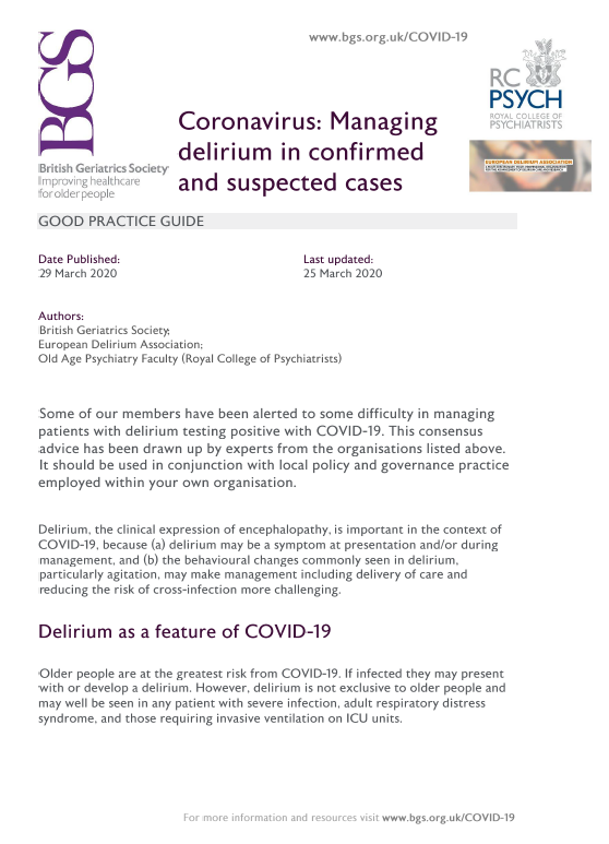 Some of our members have been alerted to some difficulty in managing patients with delirium testing positive with COVID-19. This consensus advice has been drawn up by experts from the organisations listed above. It should be used in conjunction with local policy and governance practice employed within your own organisation.