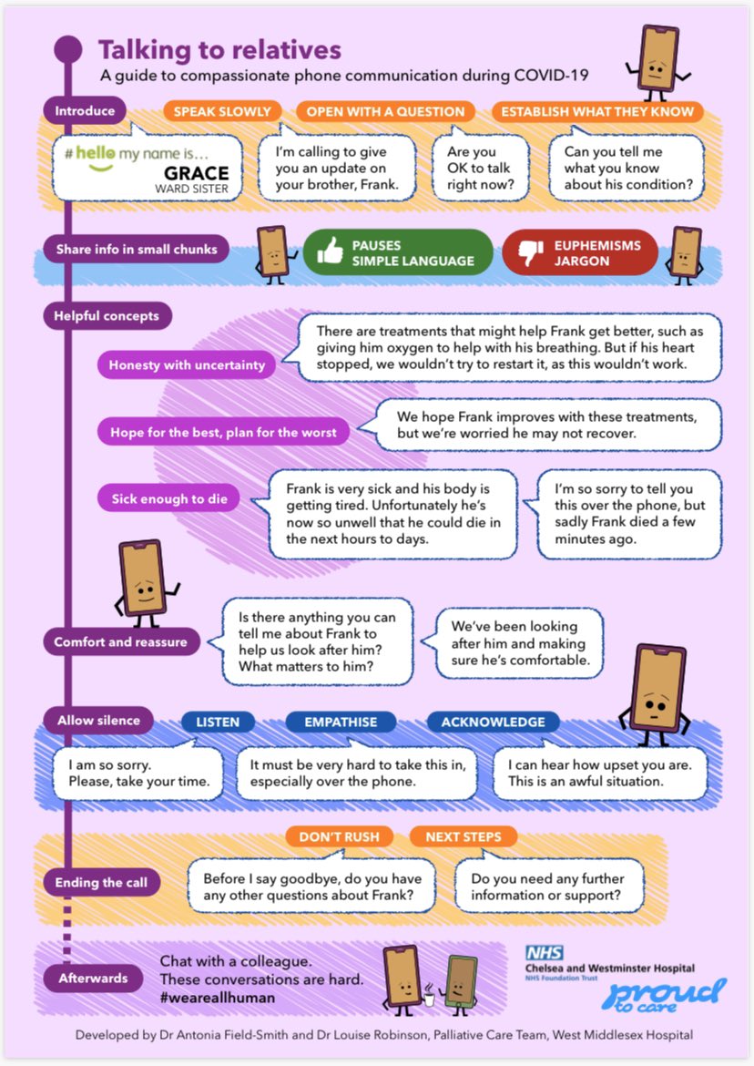 This handy visual guide to breaking bad news and having difficult conversations with relatives via telephone during the COVID-19 outbreak was developed by Dr Antonia Field-Smith and Dr Louise Robinson from the Palliative Care Team at West Middlesex Hospital, NHS Chelsea and Westminster Hospital Foundation Trust.