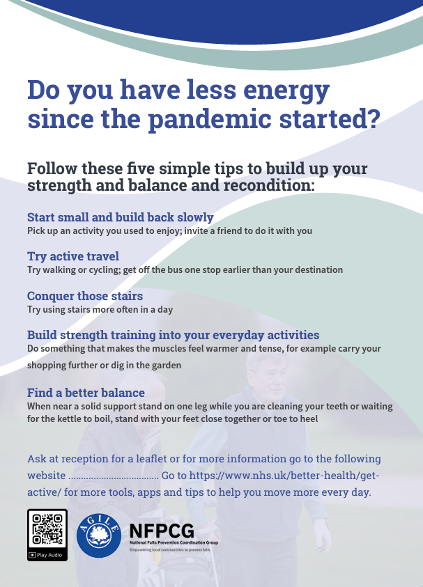 In response to the recommendations in the Public Health England 2021 COVID-19: wider impacts on people aged 65 and over guidance, which provides an estimation of the impacts of COVID-19 on reduced physical activity and increased falls in older adults and recommendations to mitigate these effects, the National Falls Prevention Co-ordination Group (NFPCG) 'Deconditioning' task and finish sub-group developed a suite of five resources intended to support individuals, health and care professionals and commissioners to take action to help older adults become more active and recondition following activity restrictions in the COVID-19 pandemic.
