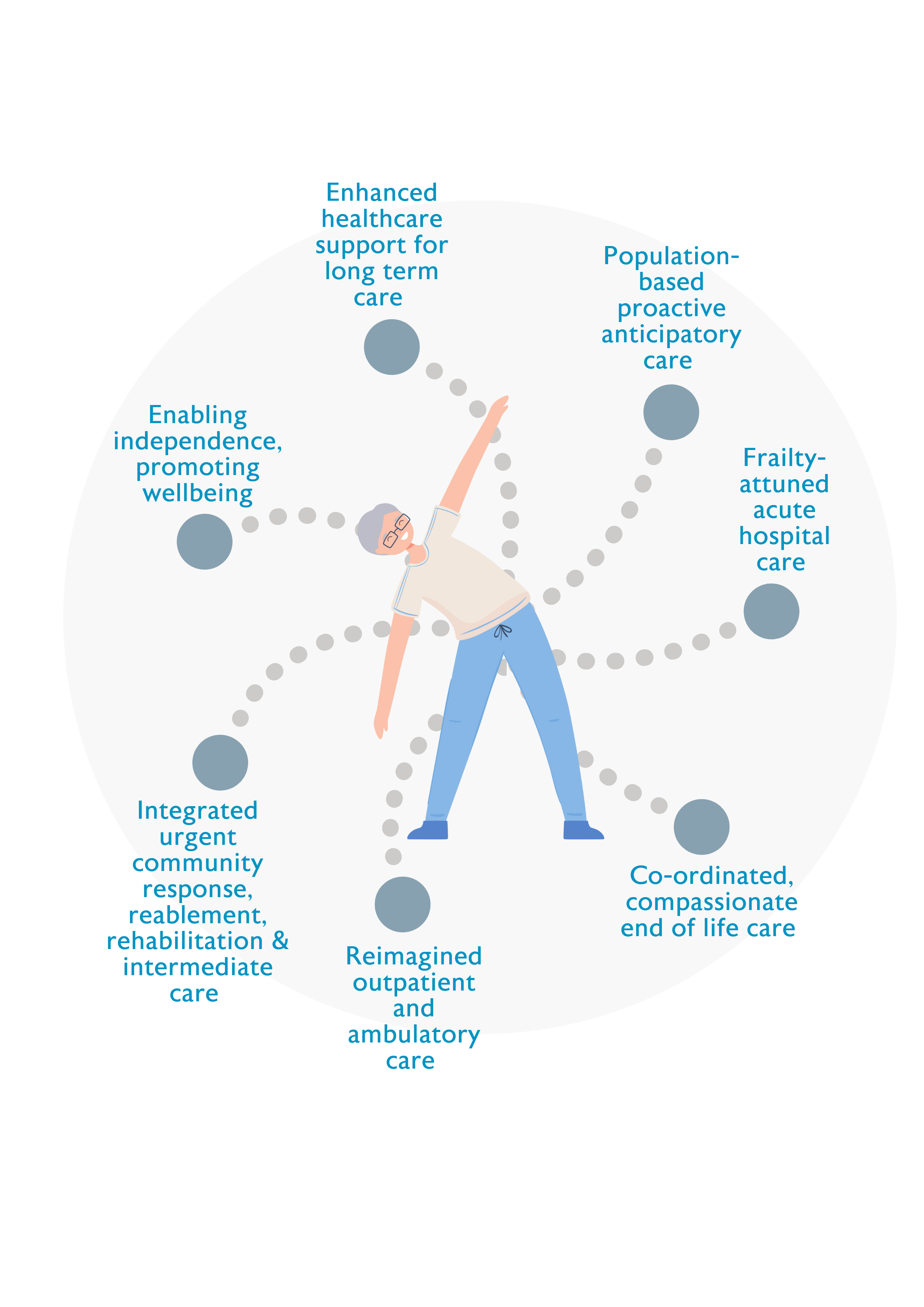 The evidence-based approaches and interventions that are required to prevent and manage frailty across the continuum of care are interdependent and mutually reinforcing and should be designed as ‘wrap around’ services that are available for all older people, wherever and whenever they are needed. Services that are designed around the needs of older people will reduce the number of people admitted to hospital as an emergency, promote early discharge home, and ensure that fewer people are readmitted to hospital or to long term care. This in turn improves outcomes for older people and reduces costs for the NHS and social care.
