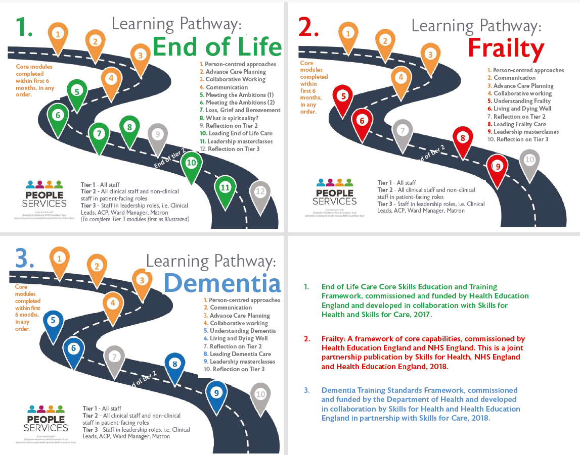 Comprehensive work was then undertaken to develop an integrated set of multidisciplinary learning pathways that incorporate the outcomes recommended within the three National Skills for Health frameworks (1,2 & 3) alongside identified local learning areas of needs and to be made available to staff from both Derbyshire Community Health Services NHS Foundation Trust and Derbyshire Healthcare NHS Foundation Trust.