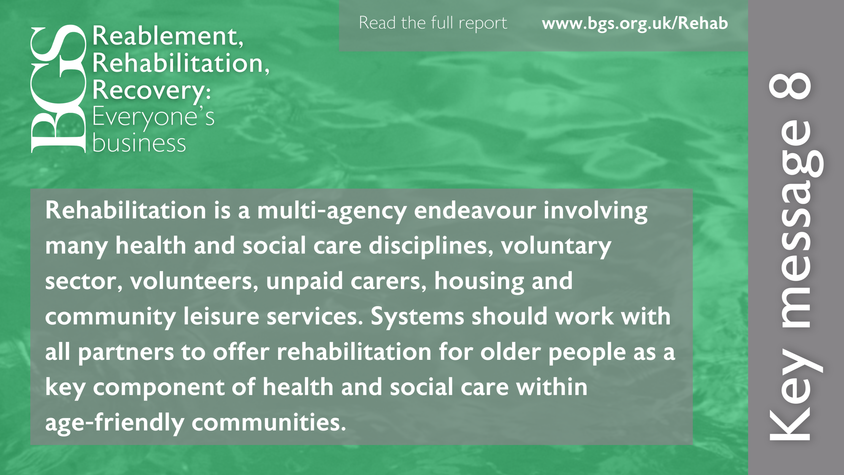 | Key message 12 Senior leadership is critical for a strategic and sustainable approach to planning and delivering rehabilitation for older people. Systems should identify a senior officer or non-executive Board member with a specific role in assuring equitable access to rehabilitation attuned to the needs of older people and continually improving the quality of service delivered. |