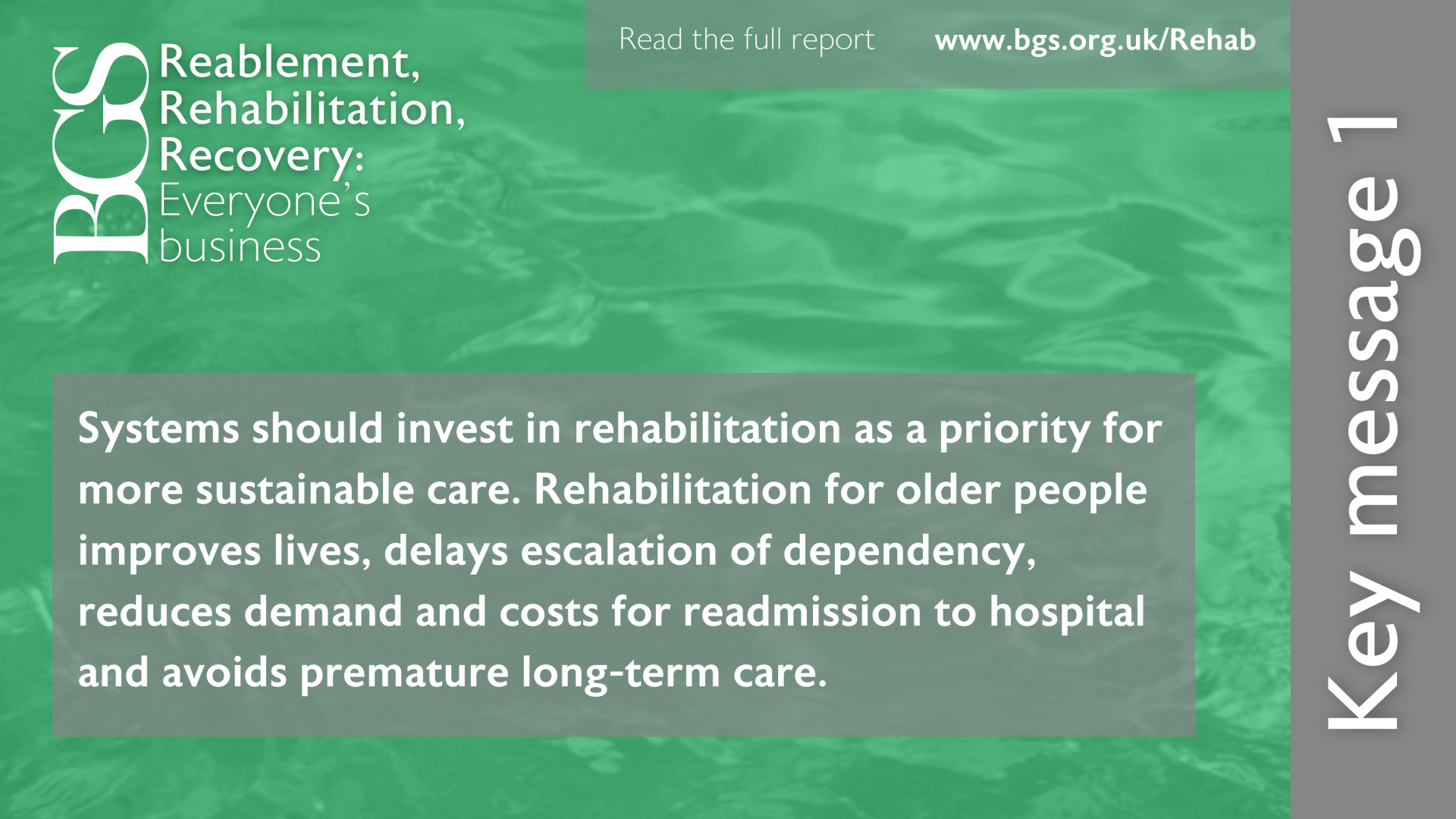 Rehabilitation for older adults is an important ‘invest to save’ approach for health and care systems as it reduces the impact of acute or chronic conditions, illnesses or injuries by preventing or delaying long term disability and dependency and reducing carer burden. Optimal rehabilitation helps prevent avoidable hospital admissions or readmissions, reduces hospital length of stay, reduces the need for long-term social care at home and reduces rates of admission to long-term care facilities. It should be embedded as a core component of care at all levels of an integrated health and social care approach, and be readily accessible at home, in hospitals, in care homes, in primary care services, ambulatory care settings and in other community facilities such as leisure centres.