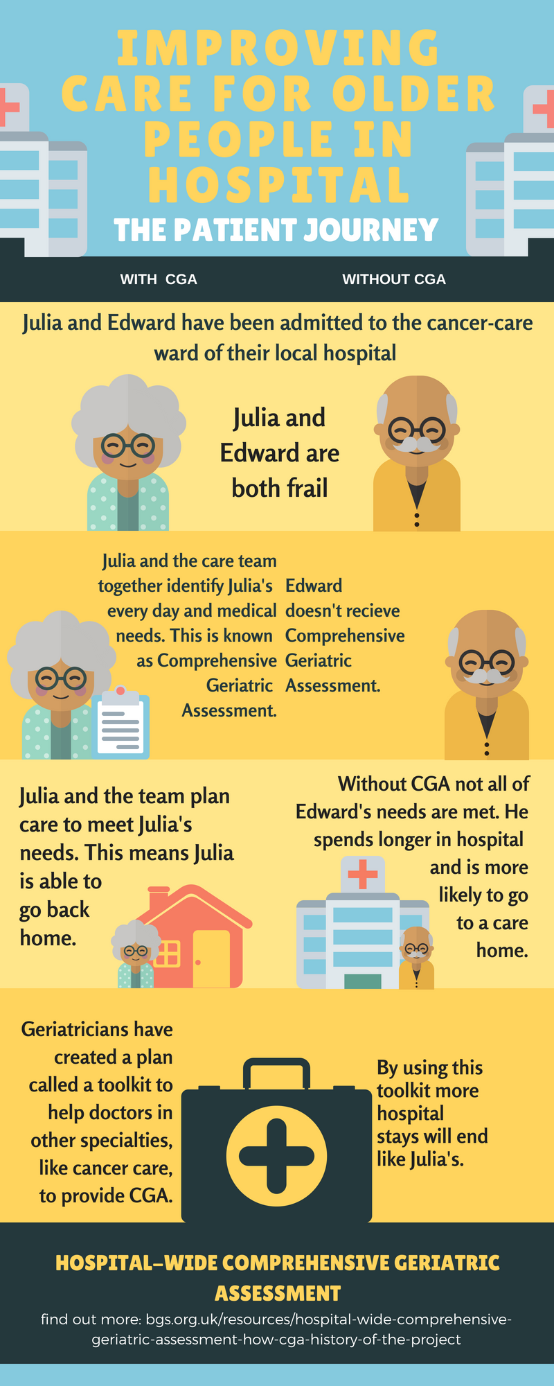 This essentially means that CGA is a process that is made up of lots of different elements and involves lots of different members of hospital staff (such as doctors, nurses and therapists). CGA identifies a person’s medical needs, as well as needs they may have outside of hospital such as accommodation or care they might need at home and, needs they may have in going about their day to day life such as walking aids or special adaptations to their homes. CGA enables members of staff to create a clear plan for how to meet these needs and how everyone can work together to make sure the plan is carried out.