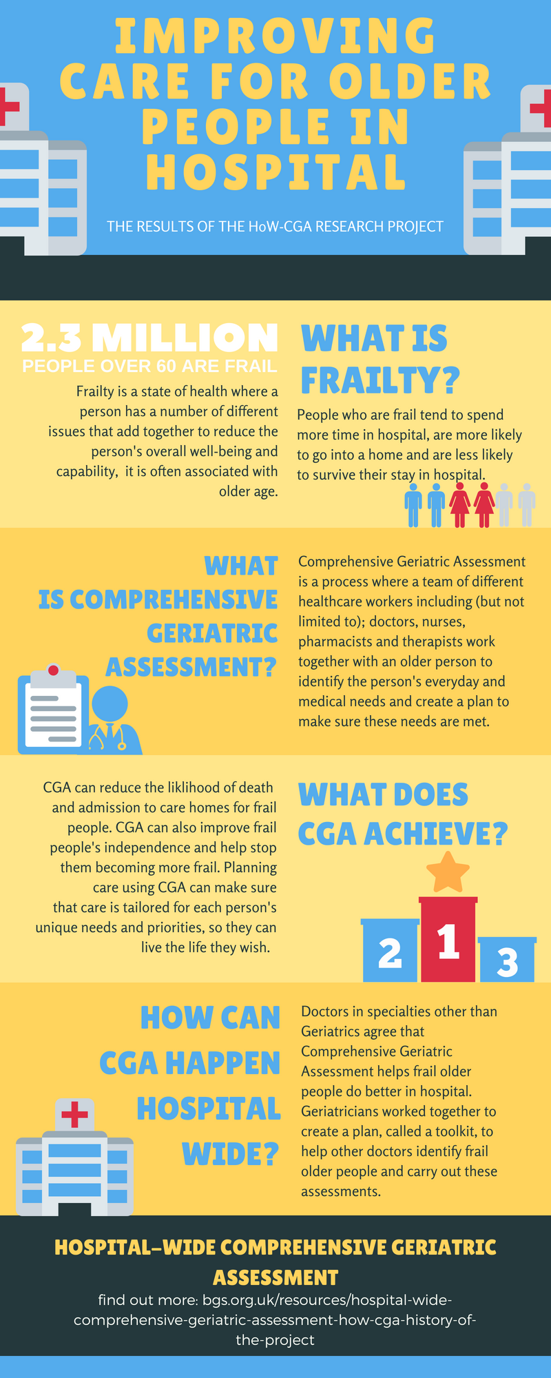 Research has shown that identifying people who are frail in hospital allows each frail person’s individual needs to be identified and then steps can be made by care teams to meet those needs. To do this a frail person can undergo Comprehensive Geriatric Assessment (CGA). CGA assess many aspects of a person’s health and wellbeing. Some examples of the many things assessed by CGA are a person’s risk of having a fall, extra help or care they might need at home and how able they are to do the everyday things that are important to them (e.g. cooking and washing). Currently, CGA is usually carried out by teams who specialise in the care of older people. The researchers in the HoW-CGA project proposed that teams in other specialties across a hospital would be able to carry out CGA for frail people in their care and that this would help improve the care a frail person received and help meet the person’s needs.
