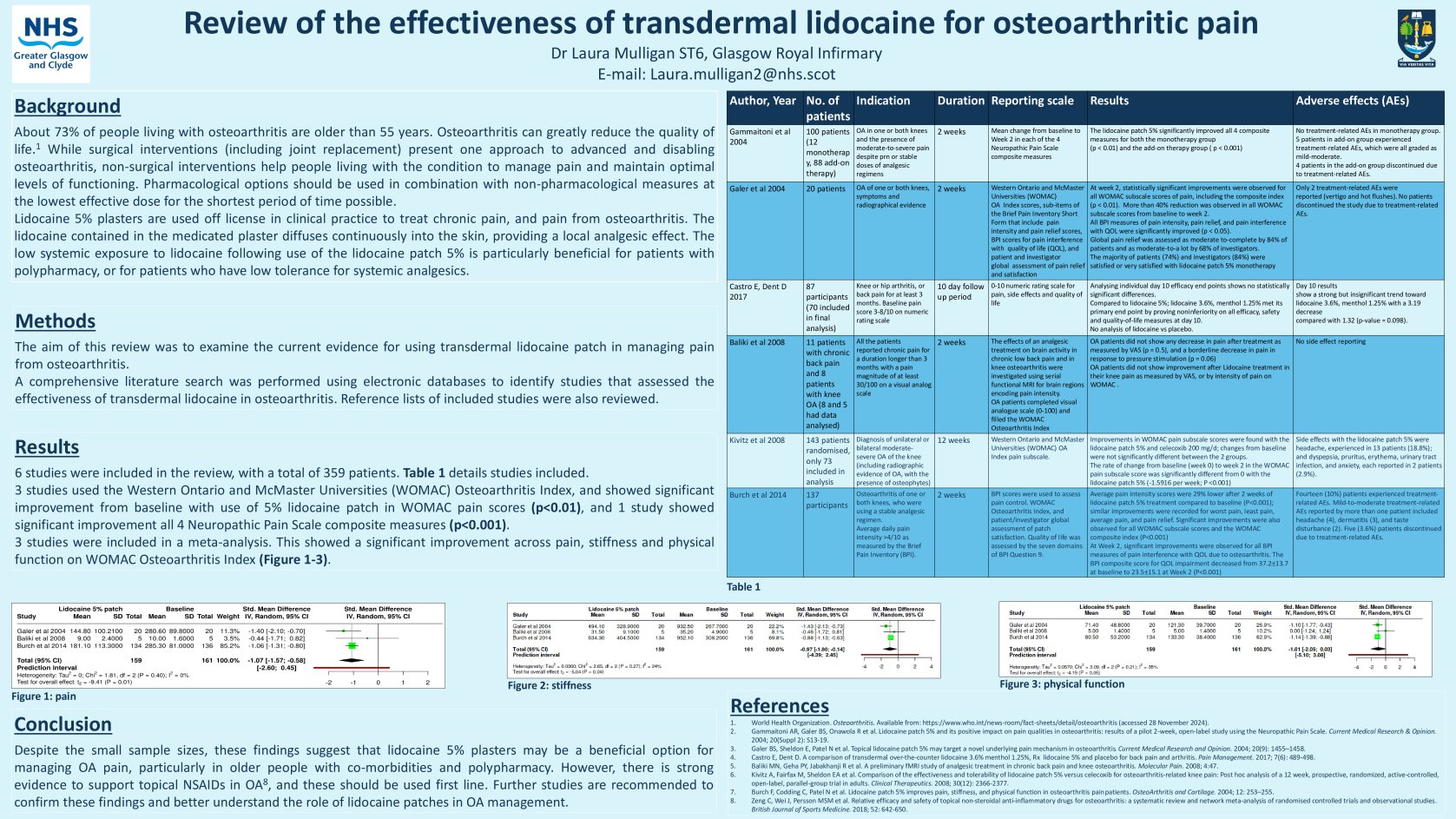 6 studies were included in the review, with a total of 359 patients. 3 studies used the Western Ontario and McMaster Universities (WOMAC) Osteoarthritis Index, and showed significant improvement from baseline with use of 5% lidocaine patch in WOMAC pain scores(p<0.01), and 1 study showed significant improvement all 4 Neuropathic Pain Scale composite measures(p<0.001). 3 studies were included in a meta-analysis. This showed a significant improvement across pain, stiffness and physical function on WOMAC Osteoarthritis Index.