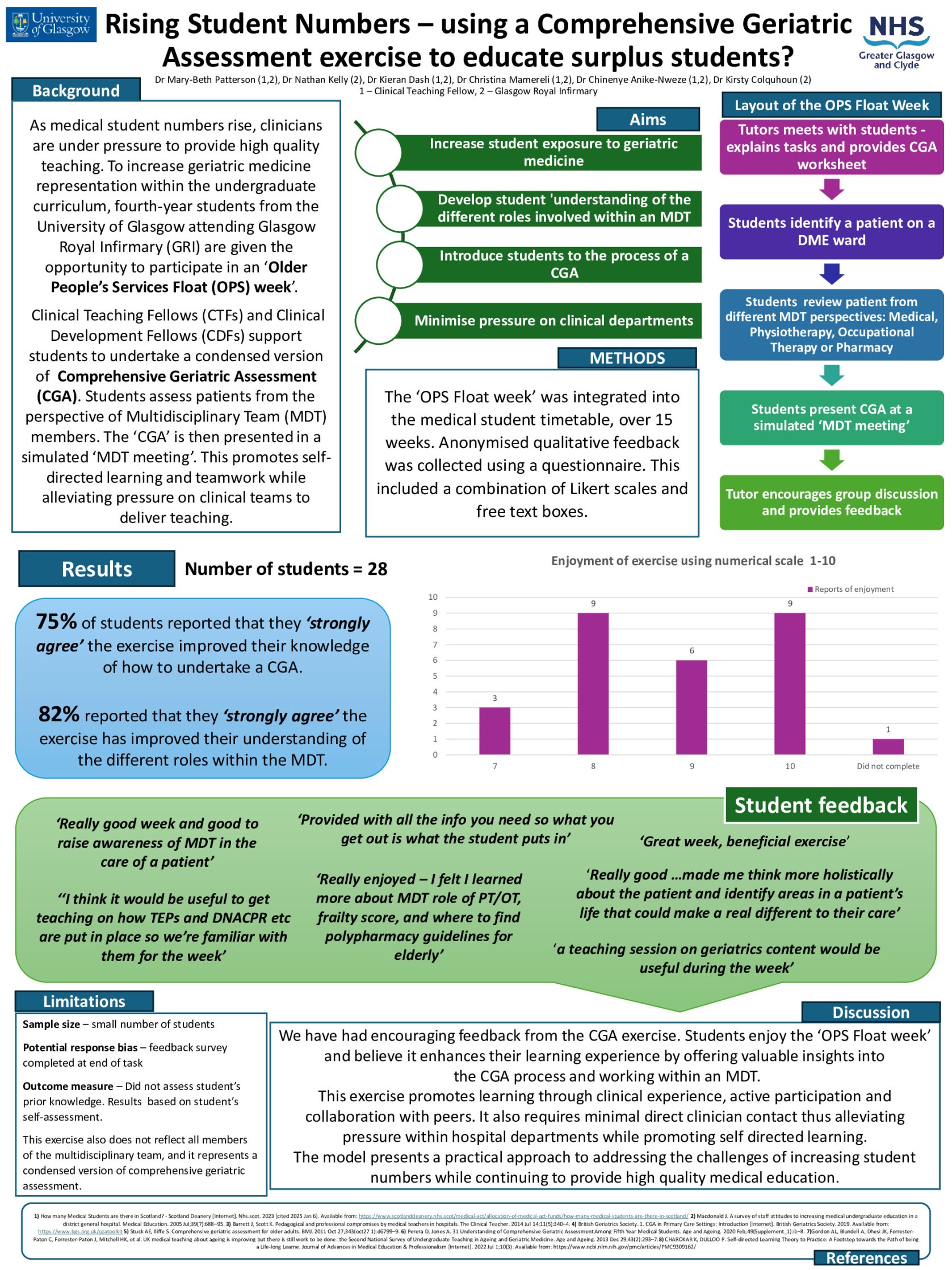 Conclusion: The introduction of the ‘OPS Float week’ has successfully enhanced the learning experience of medical students by offering valuable insights into Older People’s Services, the CGA process and working within an MDT. The model also presents a practical approach to addressing the challenges of increasing student numbers while continuing to provide high quality medical education.