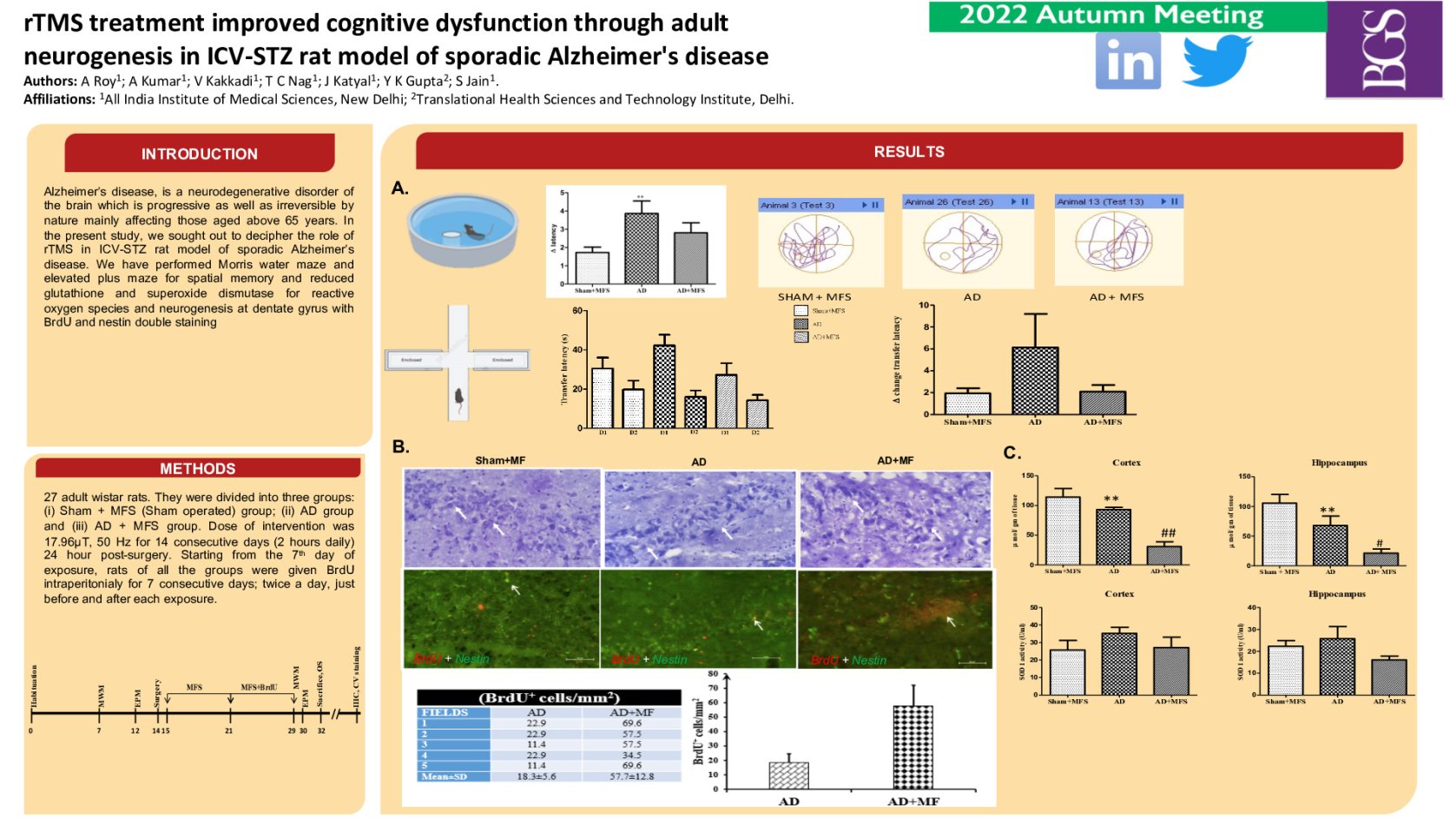 Intracerebroventricular streptozotocin injection at 3mg/kg of b/w causes phenotypes similar to that of sporadic Alzheimer’s disease (sAD) from 14th day post-injection. On the other hand, body of evidences indicated that impairment in the sAD is the major contributor for cognitive decline. Taken together, we tested the adult neurogenesis hypothesis in streptozotocin model of sAD in female Wistar rats after extremely low magnetic stimulation (MF: 17.96, 50Hz, 2hr/day, 21days). To do so, 33 rats were randomly divided into three groups viz. Sham+MF, AD and AD+MF. Consequently, animals were first induced AD with stereotaxic manipulation and then they were exposed to low frequency magnetic field stimulation and followed by terminal cognitive behavioral tasks brain tissue were isolated for both biochemical and subcellular expression experiments (ethical no. 12/IAEC-1/2017). Results showed reduction in latency to the goal quadrant (p= 0.002) and transfer latency (p= 0.045) in AD+MF group versus AD. Even, Dirichlet distribution of time spent in 4 quadrants indicated un-uniform in all the groups except AD group (p= 0.067, LRS= 7.35). Further, cell count in CA3 and DG exhibited increase in cell density in AD+MF group (p<.05). however, we found significant reduction in sod1 activity after mf treatment (p="0.035)" but no change gsh level hippocampus and frontal cortex. interestingly, these changes ad+mf animals are associated with increase density of brdu+ />Nestin+ cells in granular layer (p= 0.002) and hilus region (p= 0.0005) of DG along with increase in expression of L-type Ca2+ channels as compared to AD group. These experimental evidences suggests that noninvasive brain stimulation can promote adult neurogenesis by activating L-type ca2+ channels in the hilus, which intern helps in retention of long term memory even after sAD.