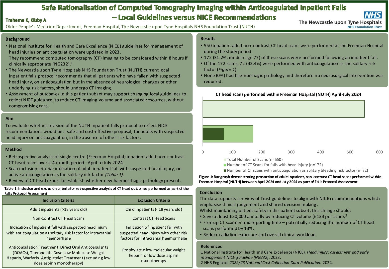 The National Institute for Health and Care Excellence (NICE) guidelines for management of head injuries on anticoagulation were updated in 2023, to maximise detection of clinically important falls whilst minimising unnecessary scans. They recommend computed tomography (CT) imaging to be considered within 8 hours if clinically appropriate [NG232].[1] The Newcastle upon Tyne Hospitals NHS Foundation Trust (NUTH) current local inpatient falls protocol recommends that all patients who have fallen with suspected head injury, on anticoagulation but in the absence of neurological changes or other underlying risk factors, should undergo CT imaging. This quality improvement project reviewed outcomes in this patient subset, retrospectively analysing patient data during a four-month period.