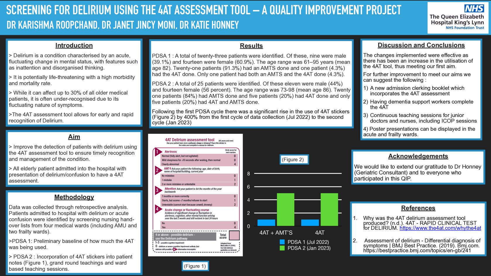 Delirium is a condition characterised by an acute, fluctuating change in mental status, with features such as inattention and disorganised thinking. It is potentially life-threatening with a high morbidity and mortality. While it can affect up to 30% of all older medical patients, it is often under-recognised due to the fluctuating nature of symptoms. The 4AT assessment tool allows for early and rapid recognition of Delirium. AIM To improve the detection of patients with delirium using the 4AT assessment tool. METHODOLOGY Patients admitted to hospital with delirium or acute confusion were identified by screening nursing hand-over lists from four wards, including two frailty wards. A retrospective analysis of their medical records was done, and specific data was extracted these including : their demographics, admission diagnoses, whether an Abbreviated Mental Test Score (AMTS) was performed on admission, and whether 4AT screening was done on the initial clerking, post-take ward round review or throughout the duration of the admission. RESULTS A total of twenty-three patients were identified across the four wards between July and November 2022. Of these, nine were male (39.1%) and fourteen were female (60.9%). The age range was 61–95 years (mean age 82). Twenty-one patients (91.3%) had an AMTS done and one patient (4.3%) had the 4AT done. Only one patient had both an AMTS and the 4AT done (4.3%). CONCLUSION From the data collected and interpreted, it can be concluded that the 4AT score is severely under-utilized which can ultimately lead to the delayed identification and management of patients with delirium. Several changes were implemented such as incorporation of 4AT stickers into clerking notes, and teaching sessions for junior doctors and nurses to raise awareness of Delirium and the 4AT tool. A second QIP cycle is currently in progress.