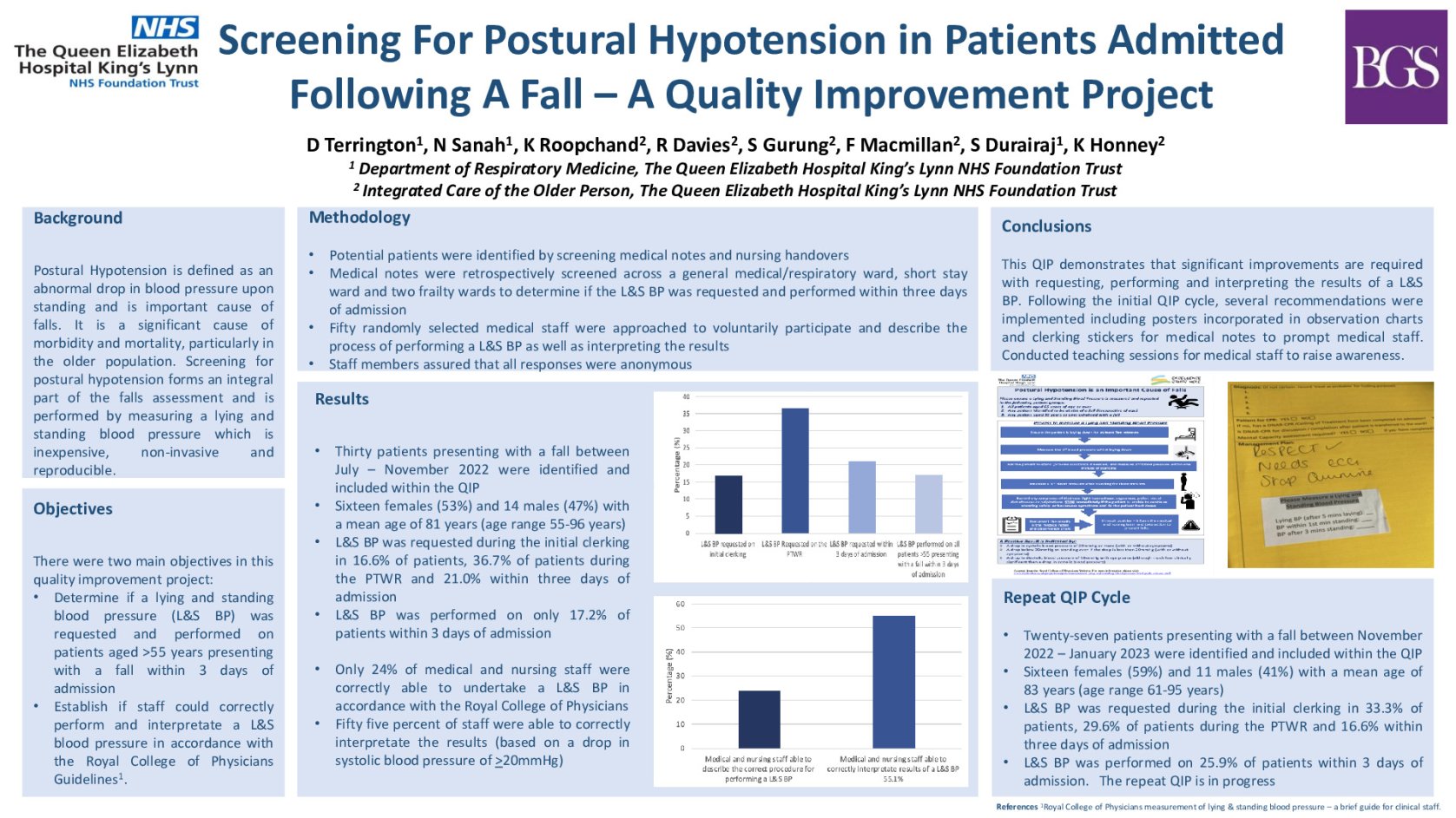 Postural hypotension is defined as an abnormal fall in blood pressure upon standing and is an important cause of falls associated with significant morbidity and mortality. Screening for postural hypotension forms an integral aspect in the overall assessment of patients presenting with a fall and furthermore is non-invasive, inexpensive and reproducible. Aims To determine if a lying and standing blood pressure (LSBP) was requested and performed on patients aged >55 years presenting with a fall within three days of admission, and furthermore, to establish if staff could correctly perform and interpret results of a LSBP in accordance with the Royal College of Physicians guidelines across four medical and frailty wards. Method Potential patients were identified by screening nursing handovers. Medical notes were retrospectively reviewed to determine if a LSBP was requested and performed during the initial clerking, post-take ward round (PTWR) or subsequent three days following admission. Fifty staff members were then approached and asked to describe the process of undertaking a LSBP. Results Thirty patients presenting with a fall were identified and admitted during July – November 2022. This included sixteen females (53%) with a mean age of 81 years (range 55-96 years). Two patients were not formally clerked and a LSBP was requested in only 5 (16.6%) patients during initial clerking and 11 (36.7%) during the PTWR. Where not initially requested, four patients (21%) had a LSBP requested within three days of admission and 5 (17.2%) had a subsequent LSBP measurement performed. Only 24% of staff correctly described the process of performing a LSBP. Conclusion This QIP demonstrates significant improvements are required in requesting and correctly performing LSBP measurements. Several recommendations were implemented including posters incorporated in observation charts, clerking labels and improved education for nurses. A repeat QIP cycle is currently underway and results are imminent.