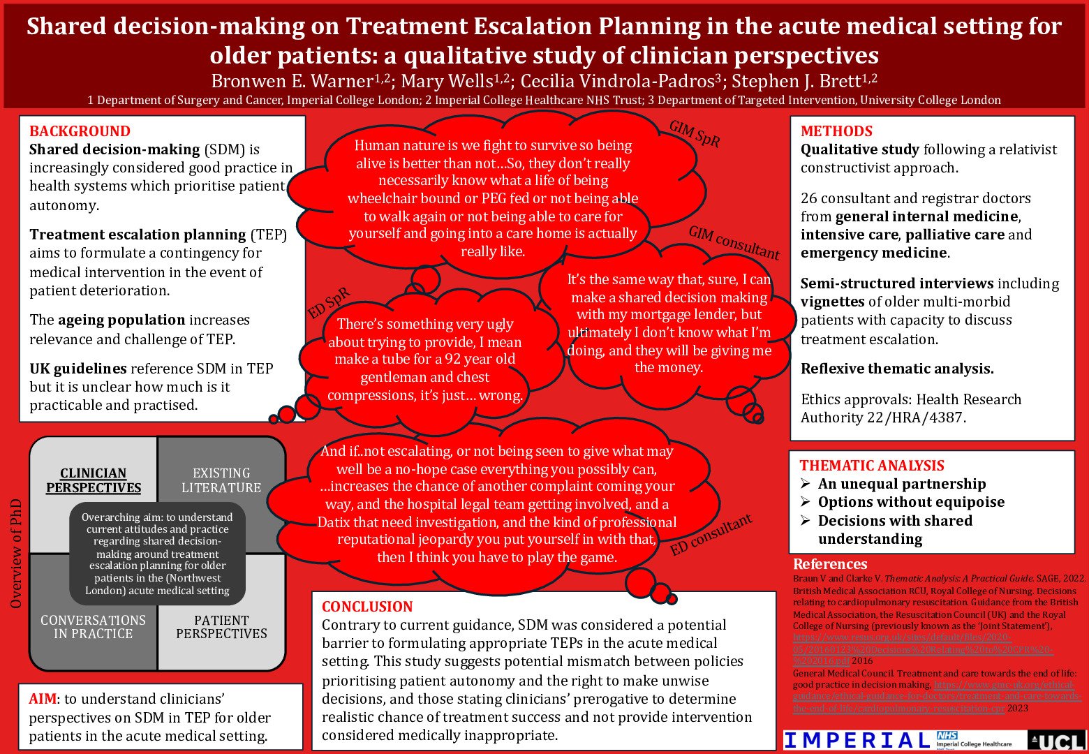 Shared Decision-Making (SDM) is increasingly expected in most aspects of UK medical practice and can be particularly important for older patients to guide goals of care. Treatment Escalation Plans (TEP) summarise medical intervention to be attempted in the event of acute deterioration. Current guidance advocates SDM in TEP but it is unclear whether this is considered practicable by clinicians. This study aims to understand clinicians’ perspectives on SDM in TEP for older patients in the acute medical setting.