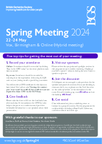 The BGS Spring meeting will cover the latest scientific research and the best clinical practice in care of older people. Our ageing population is stimulating extensive NHS service redesign to deal with the challenge of caring for larger numbers of older people both in and out of hospitals. This conference will cover core areas of interest to all specialists responsible for the health care of older people.