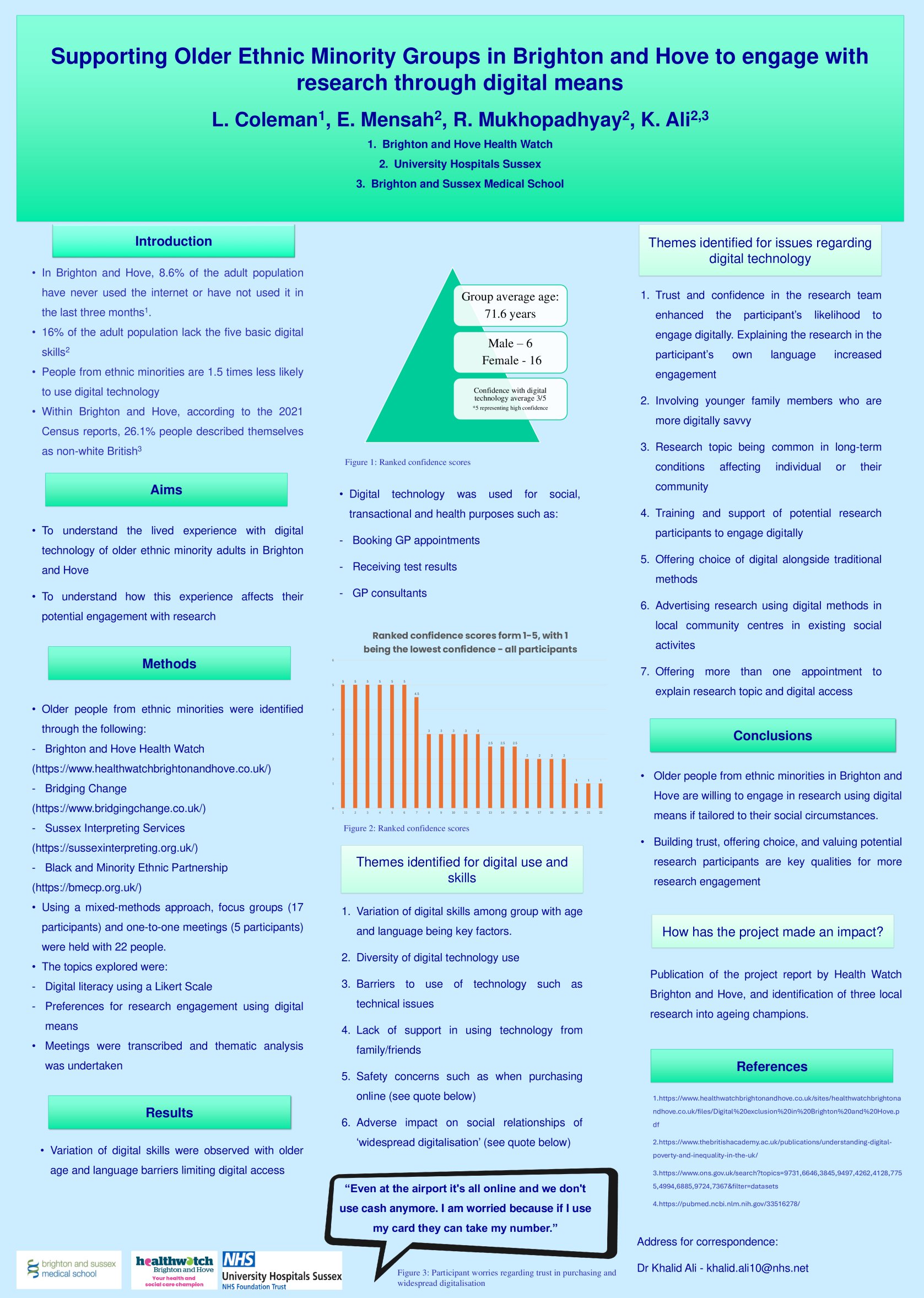 People from ethnic minorities are 1.5 times less likely to use digital technology. Within Brighton and Hove, 2021 Census reports that 26.1% described themselves as non-White-British categorised as other White (11.5%), Mixed Race (4.8%), Asian (3.7%), Black (2.0%), Chinese (1.1%), Arab (1.1%), and Other (2.0%). The aim of the project was to understand the lived experience of older ethnic minority adults in Brighton and Hove with digital technology, and how this experience affects their potential engagement with research.