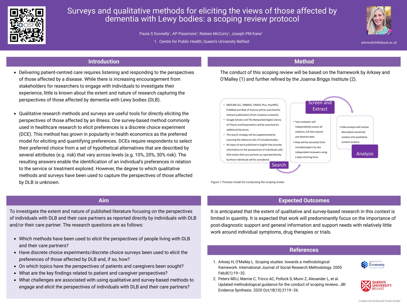Dementia with Lewy bodies (DLB) is one of the most common degenerative dementias, and it is associated not only with cognitive symptoms, but motor, neuropsychiatric, sleep and autonomic symptoms. There is increasing emphasis on the involvement of patients and their representatives in dementia research, but little is known about the extent and nature of surveys and qualitative research methods capturing the views of those affected by DLB. The objective of the scoping review is to determine the extent and nature of published literature that uses surveys and qualitative methods to elicit the views of people diagnosed with DLB and their care partners.