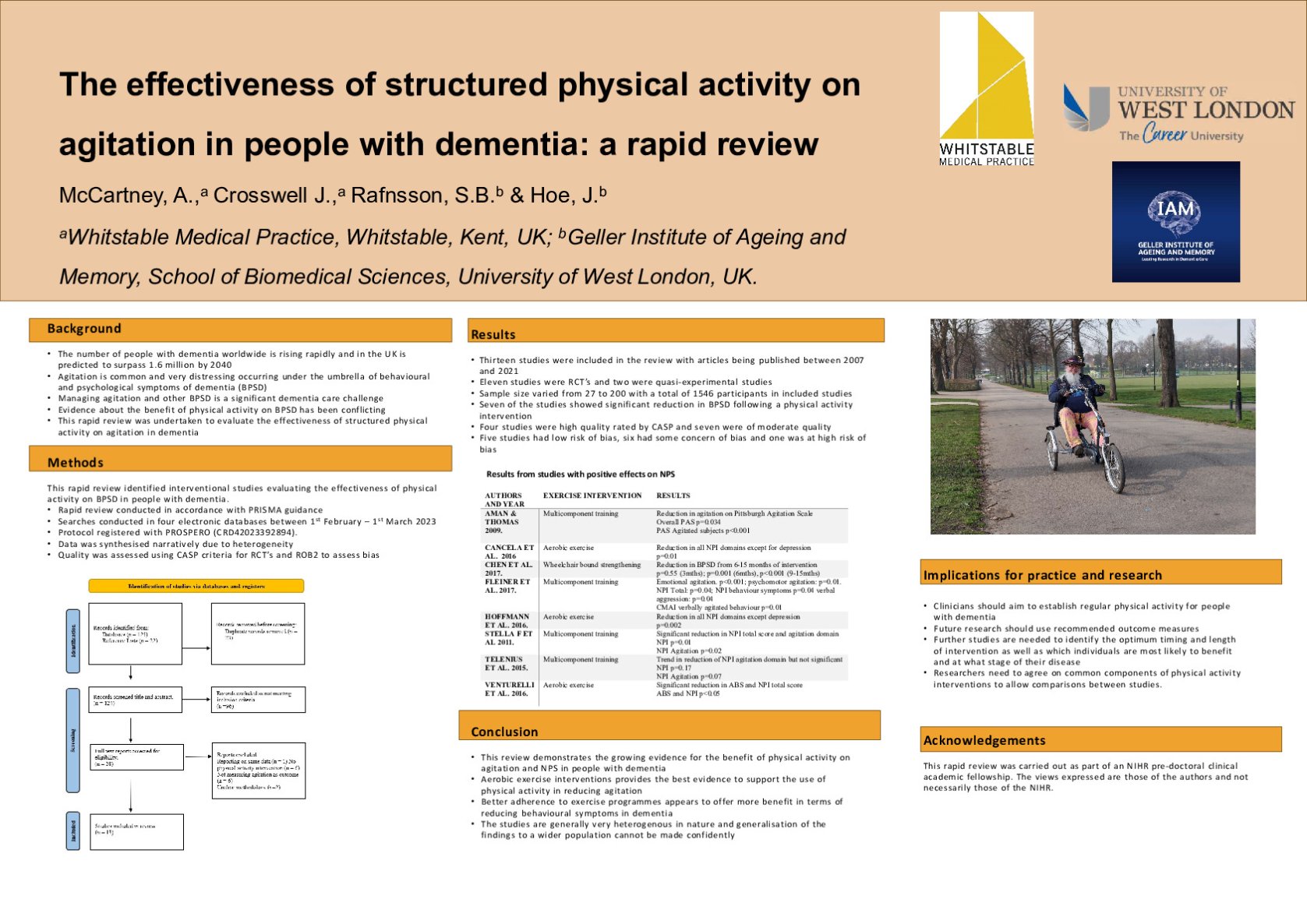 Conclusions: There is evidence that physical activity can be effective in the reduction of agitation in older adults with a dementia diagnosis. Further research is needed to clarify the type of intervention that is most beneficial and strategies to make physical activity more acceptable and available to older people with dementia need to be established