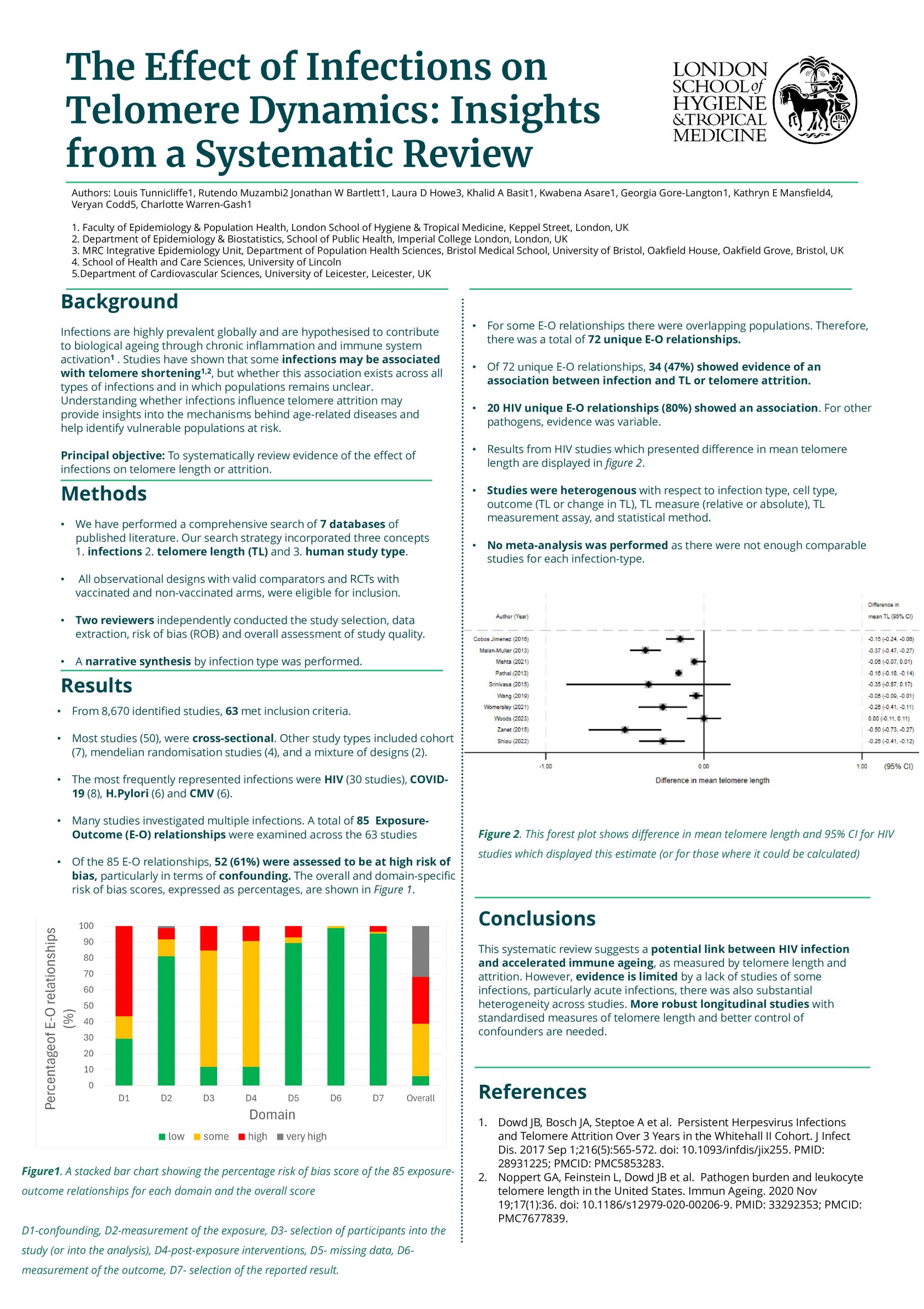 From 8,670 identified studies, 63 met inclusion criteria. Most studies (50) were cross-sectional and conducted after 2000, with the earliest from 1996. The USA was the most frequent study location (15 studies). HIV was the most studied infection (30 studies), followed by COVID-19 (8 studies), and then Cytomegalovirus and H.pylori (6 studies each). Eighty percent (20) of HIV studies (of those without overlapping samples) reported evidence of an association between HIV and shorter TL or increased telomere attrition. Findings for other infections were more variable. Differences in infection types, telomere measurement methods, cell types analysed, and statistical approaches, complicated cross-study comparisons. Furthermore, risk of bias was high in most studies, mainly due to risk of unmeasured confounding.