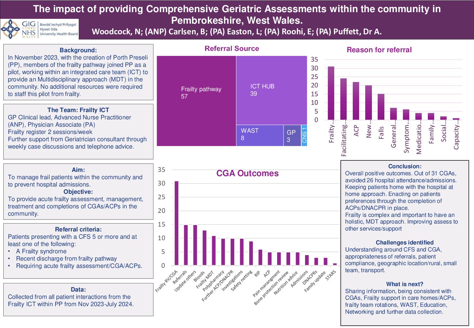 Conclusion: Overall positive outcomes. Out of 31 CGAs, avoided 26 hospital attendance/admissions. Keeping patients home with the hospital at home approach, with the further support from ICT. Enacting on patients preferences through the completion of ACPs. Frailty is complex and it is important to have a holistic MDT approach. Improving assess to other services/support.