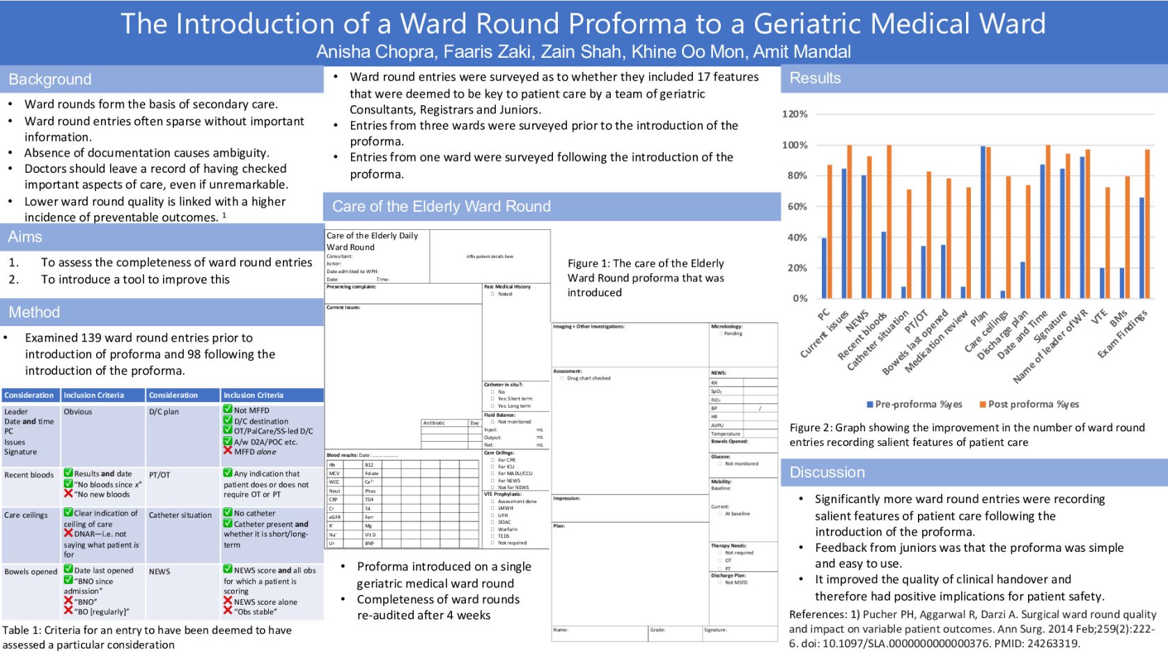Background: Ward round entries form the backbone of medical documentation, forming the context in which new diagnoses and safe handovers are made. They are also an important legal record that should be clear and up to date. Ward round entries without important information, including vital observations and examination findings, cause ambiguity as to whether these aspects of patient care have been reviewed.