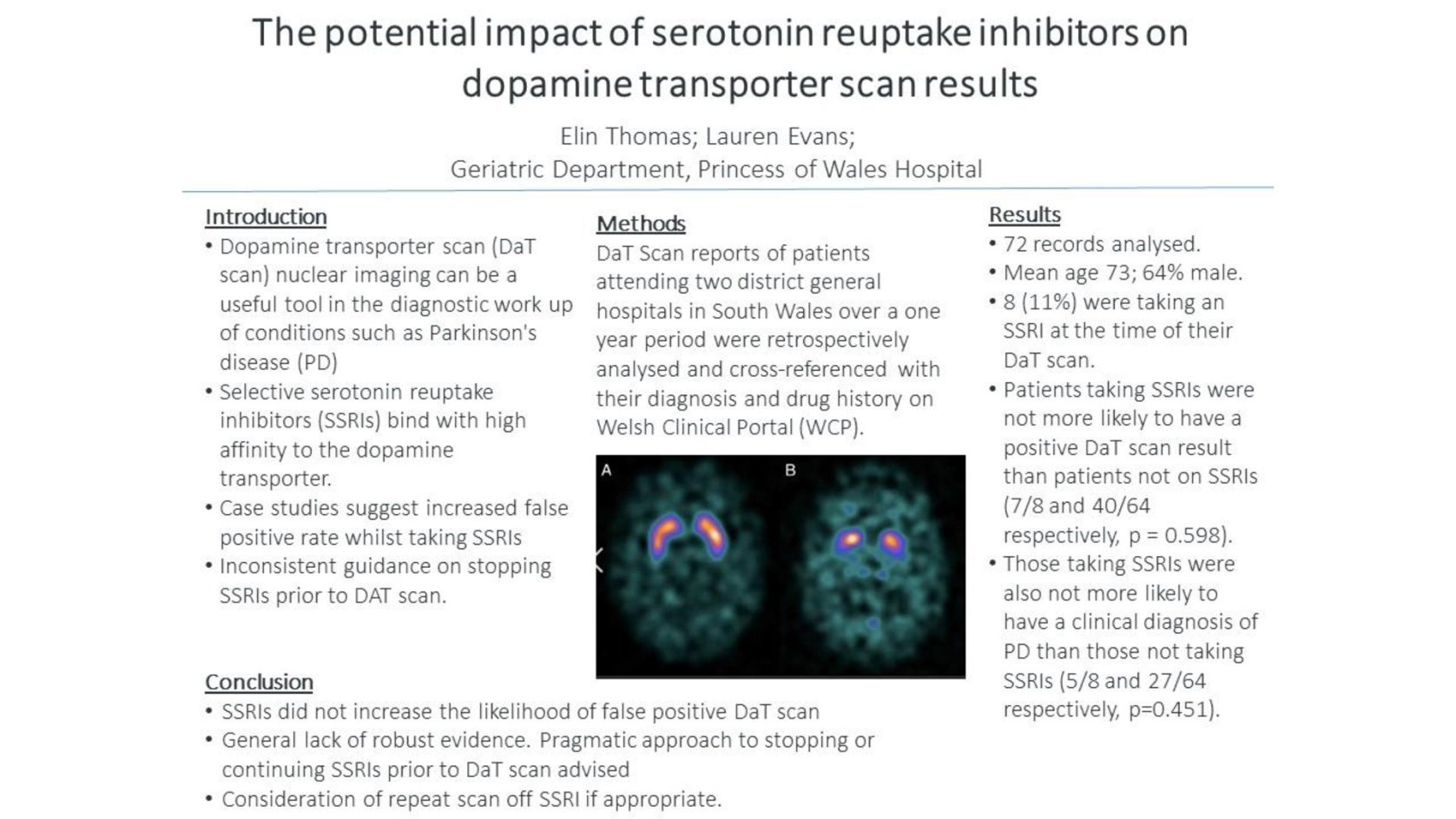DaT Scan reports of patients attending two district general hospitals in South Wales over a one year period were retrospectively analysed and cross-referenced with their diagnosis and drug history on Welsh Clinical Portal (WCP).