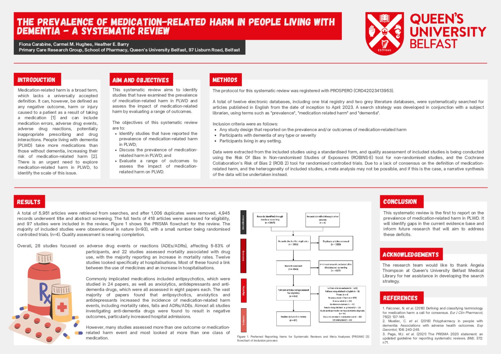 Introduction Medication-related harm (MRH) is defined as any negative outcome, harm or injury caused by taking a medication (Falconer et al. Eur J Clin Pharmacol, 2018;75(2):137-145). People living with dementia (PLWD) take more medications than those without dementia, increasing their risk of MRH (Mueller et al. Exp Gerontol 2018;106:240-245). There is urgent need to explore the scale of MRH affecting PLWD. This systematic review aimed to determine the prevalence of MRH in PLWD and evaluate various outcomes to assess its impact.