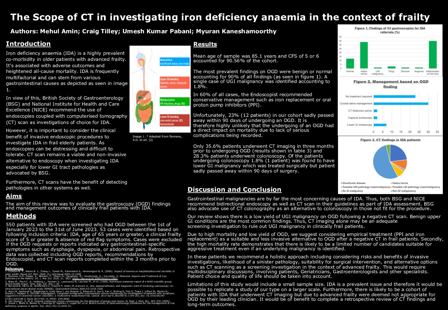 Iron Deficiency Anaemia (IDA) is a highly prevalent co-morbidity in older patients with advanced frailty. It’s associated with adverse outcomes and heightened all-cause mortality. IDA is frequently multifactorial and can stem from various gastrointestinal causes. The British Society of Gastroenterology and National Institute for Health and Care Excellence advocate a combination of endoscopy and computerised tomography (CT) as the gold standard investigations for IDA. The aim of this review was to evaluate oesophagogastroduodenoscopy (OGD) findings and management outcomes of clinically frail patients with IDA.