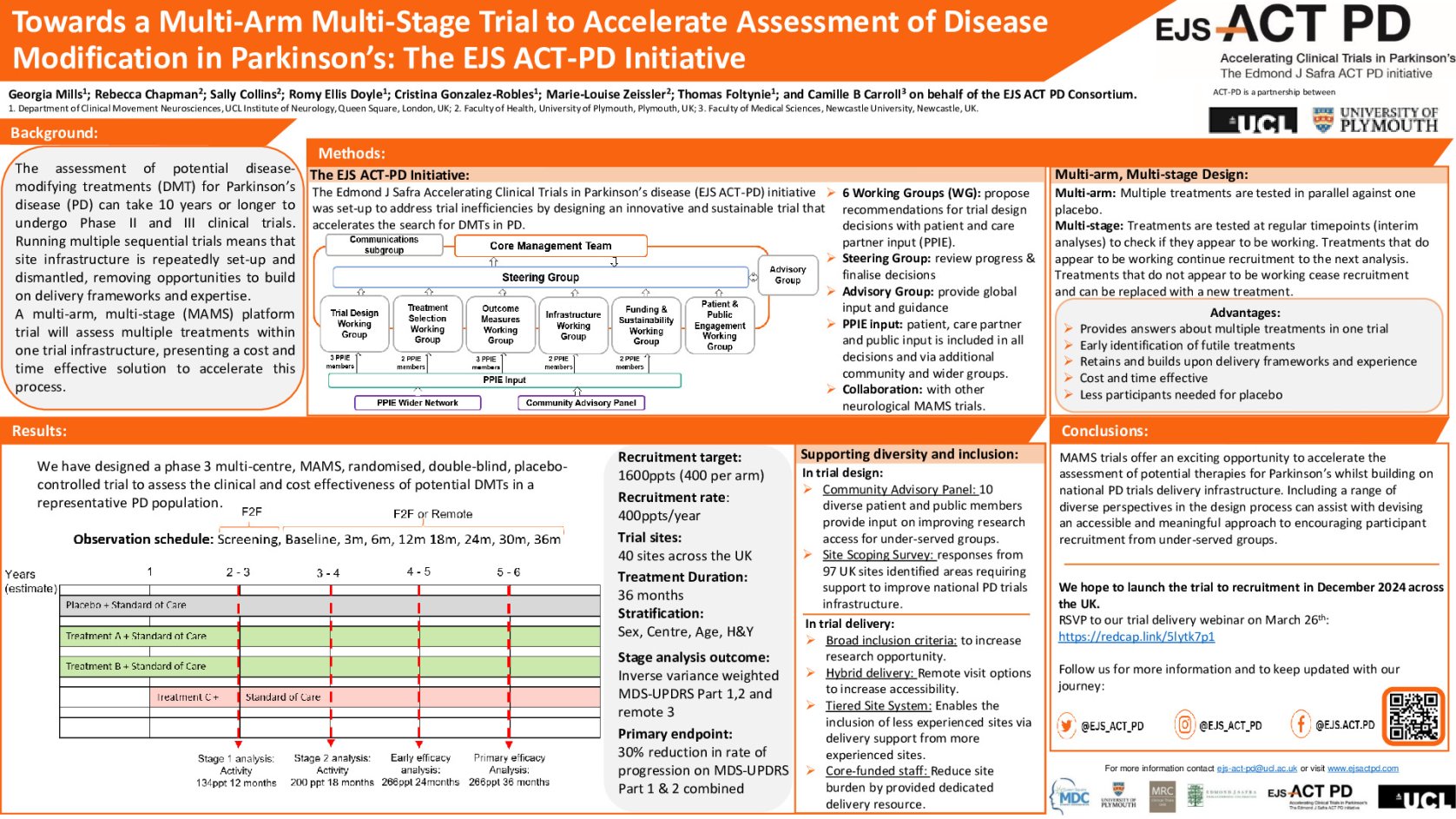 Over 90 key stakeholders from across the UK, including people with PD and care partners form the EJS ACT-PD consortium. Six working groups have addressed trial design, outcome measures, therapy selection, infrastructure, funding and sustainability, and patient and public inclusion. Design decisions have been further informed by: a community advisory panel; an international advisory group; the MHRA; results of a UK-wide Site Capability Survey; a robust treatment selection process; statistical modelling; and literature reviews.