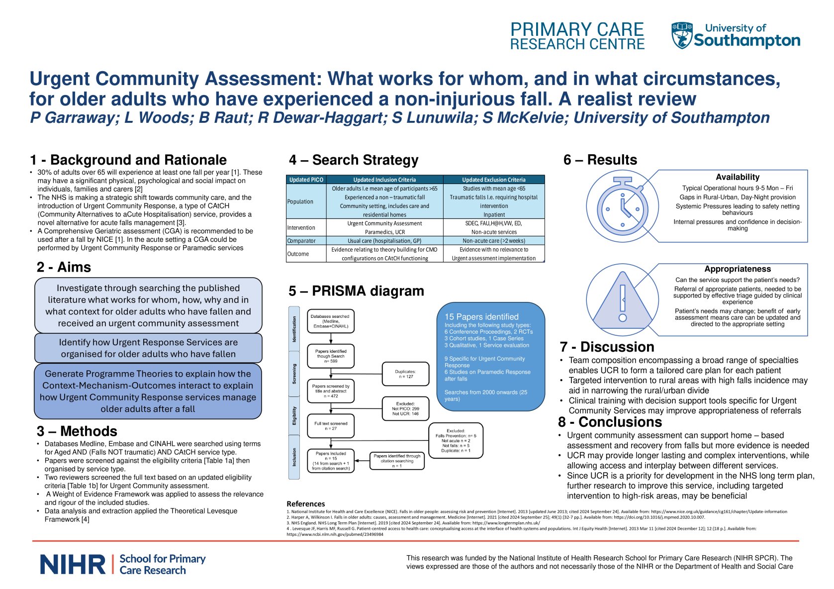 Conclusions: Falls have a large impact on patients, families and carers. UCR may allow for home-based care and be helpful at directing onward care, even within hospital. Team working in UCR services may support reducing hospitalisations and falls prevention. Further research is needed to improve UCR triage processes, and health systems should consider how UCR services can be integrated for falls management for older people.