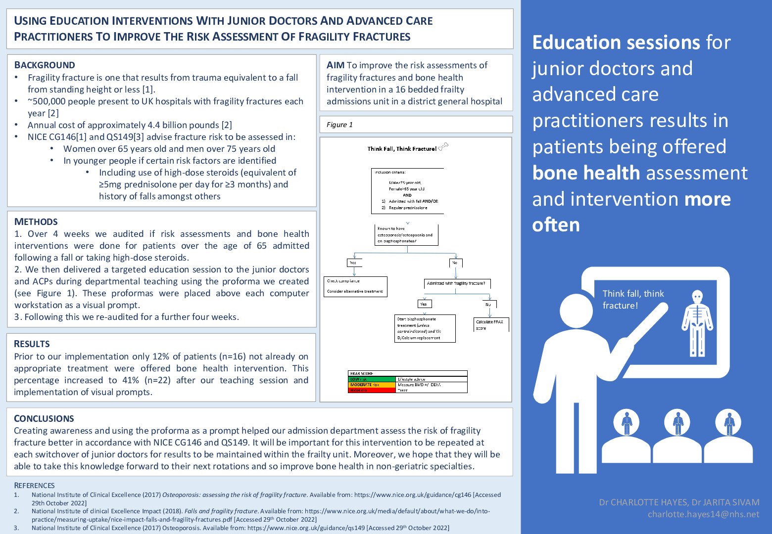This project aimed to improve the frequency both of fragility fracture risk assessment and bone health intervention in a busy frailty admissions unit in a district general hospital.