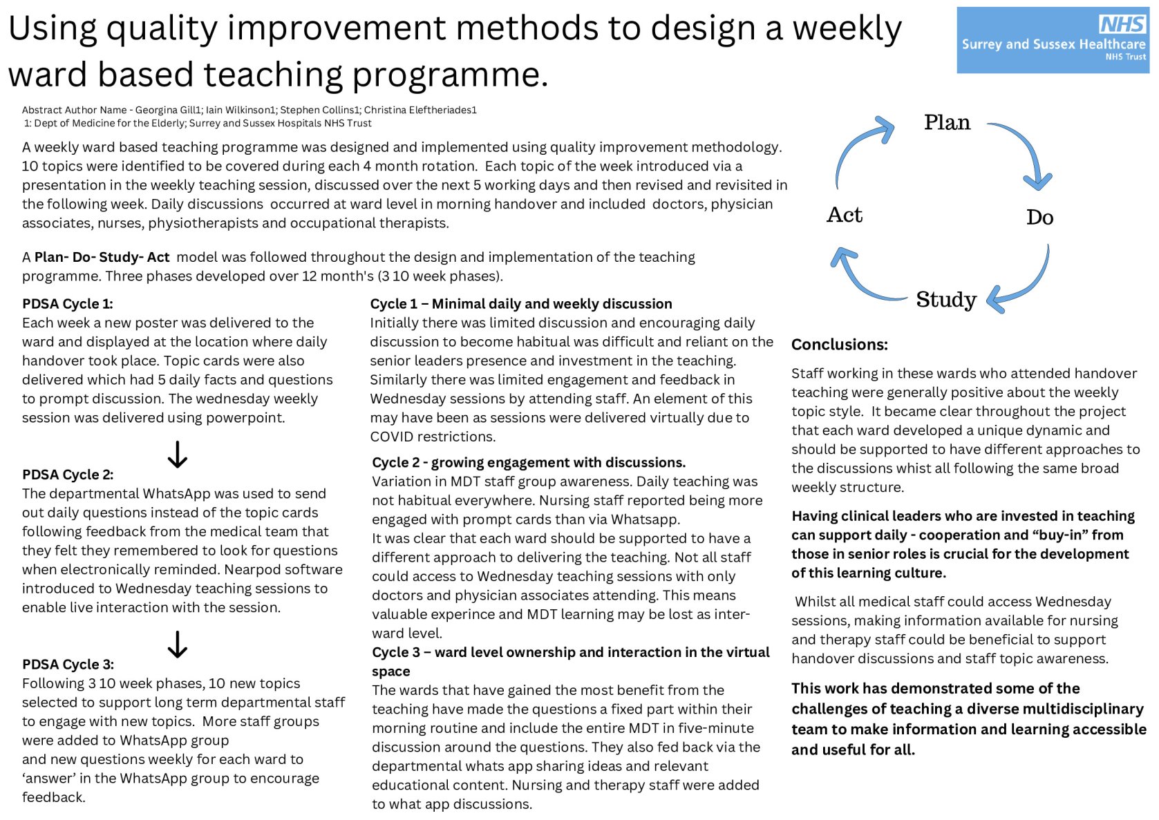 Conclusion: Staff working in these wards were generally positive about the weekly topic style. Having clinical leaders who are invested in teaching can support daily - cooperation and “buy-in” from those in senior roles is crucial for the development of this learning culture. This work has demonstrated some of the challenges of teaching a diverse multidisciplinary team to make information and learning accessible and useful for all.